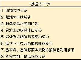 次に食品に含まれる塩分量について見てみましょう。醤油は大さじ1杯で2.6gもの食塩を含んでいるため、「かけ醤油」の習慣がある方は「つけ醤油」に改めるだけでも食塩摂取量を減らすことができます。また、味噌汁には一杯2gの食塩が含まれており、1日に2杯以上のむ方は1回の量を減らすことが大切です。そのほかの食品塩分量や減塩のコツについては(写真2)、(写真3)をご覧ください。是非、自分に合った減塩対策を探して、取り組んでみてくださいね。