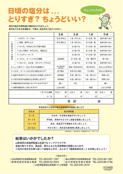 ※以下のリンク(山形県ホームページ)から塩分チェックシートと食品塩分量ポスターが入手できます。