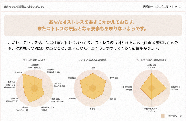 具体的には、体を動かしてネガティブな気分を発散させたり、もやもやした気持ちを抱えている時には、それを紙に書き出してみたりすることも有効です。先程の「5分でできる職場のストレスセルフチェック」は、チェック後にストレスケアのアドバイスもしてくれるため、それを参考にしてみてもいいと思います。